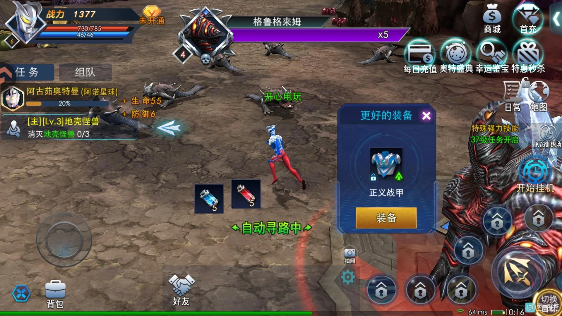 这段超燃的奥特曼题材内容,集结了众多奥特曼英雄,经典形象与技能都完美复刻了剧中的精彩表现。普攻连击配合特色技能,带来流畅爽快的打击体验。原创热血剧情紧密贴合原作设定,BOSS战、联机PK等玩法十分丰富,而且福利丰厚,零氪玩家也能轻松畅玩,特摄粉沉浸其中守护地球,成就感满满!