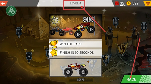 1、选择【LEVEL-4】并点击【RACE】启动游戏,需达成【WIN-THE-RACE】目标且在90秒内完成比赛,以此解锁埃及场景的竞速挑战。
