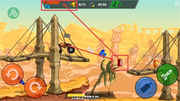 2、在埃及赛道中,留意下方陷阱,攻击【12th】车辆,利用右侧【火箭】【加速瓶】道具提升排名,应对对手挑战。