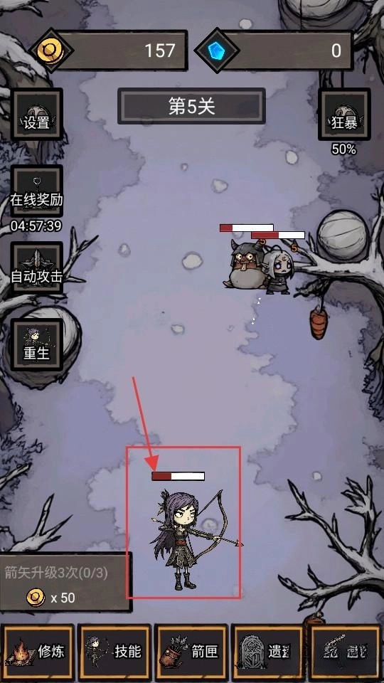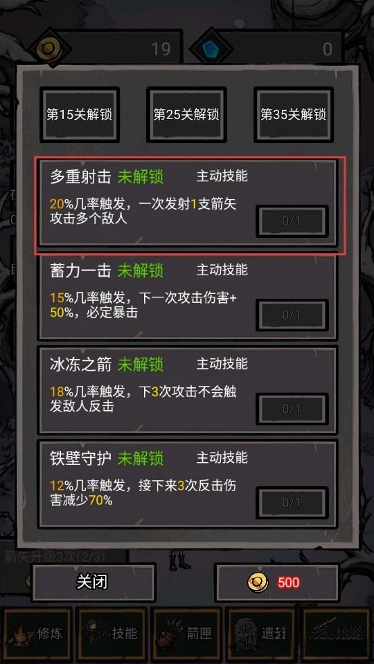 4.玩家打过15关会解锁第一个技能,建议选择多重射击,增加攻击速度