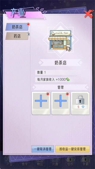 进入【产业】界面,全面掌控家族旗下店铺运营——从网红奶茶店到连锁药店,每一项都是收入来源。指派合适成员担任管理者,发挥其特长最大化收益。更可消耗钻石解锁更多管理席位,拓展商业版图,逐步构建横跨多领域的豪门财团。