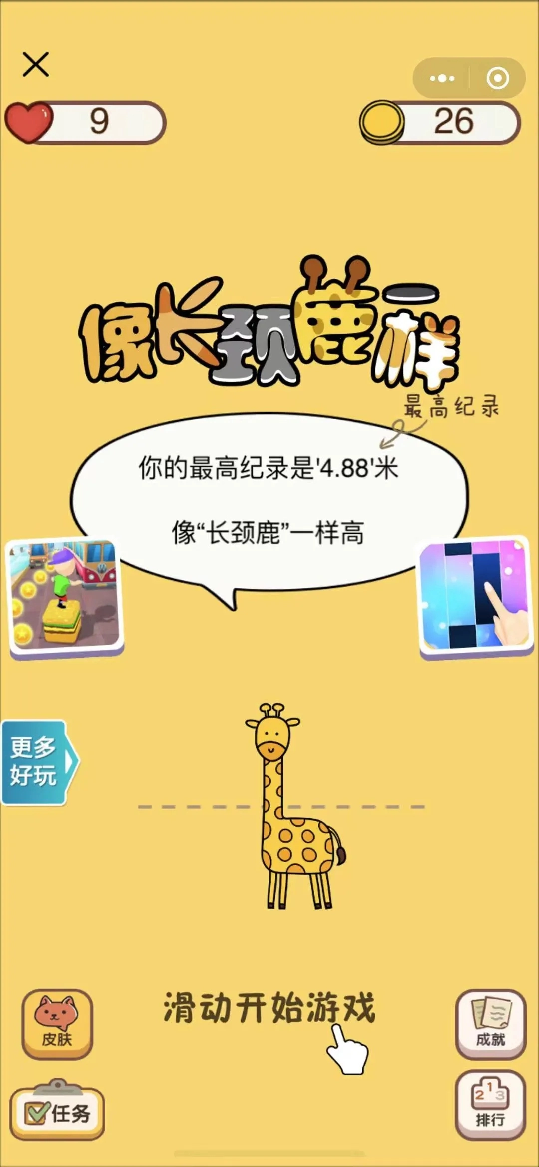 《像长颈鹿一样》小程序是一款趣味十足的休闲冒险游戏,在魔性音乐反应类游戏里堪称好玩之作。在这款小程序游戏中,玩家需要通过吃掉长颈鹿脖子上的东西,让它的脖子变得越来越长。在游戏欢快有趣的音乐氛围加持下,整体游玩体验十分愉悦,感兴趣的朋友可千万别错过这场音乐之旅。
