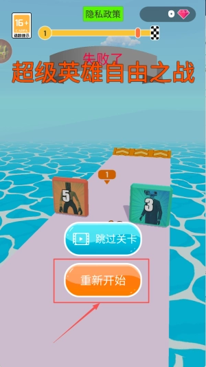 4、重新开始或跳过关卡:战斗失败后,可选择“重新开始”按钮再次挑战,也能点击“跳过关卡”按钮略过当前关卡。