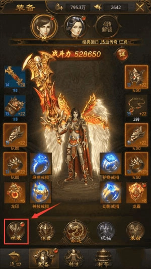 装备类型包括普通装备、雷霆装备、传世装备与霸业装备,这些装备能帮助角色快速增强战力。玩家可以通过获取更高级别的装备,触发套装属性效果,从而进一步提升自身的战斗力。