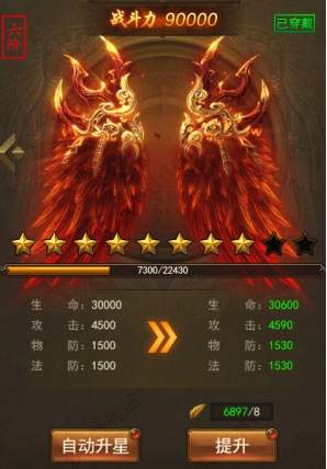 翅膀的作用不止于增强战力,还能让角色的外观发生改变。目前共有12种翅膀,每种翅膀带来的属性加成各有差异。通过消耗羽毛来提升翅膀等级,就能获取丰厚的属性增益。