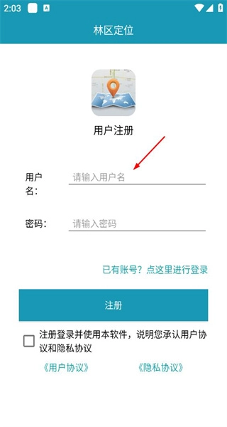 4、进入林区定位用户注册页面,找到用户名输入框,准备填写信息,完成账号注册流程。