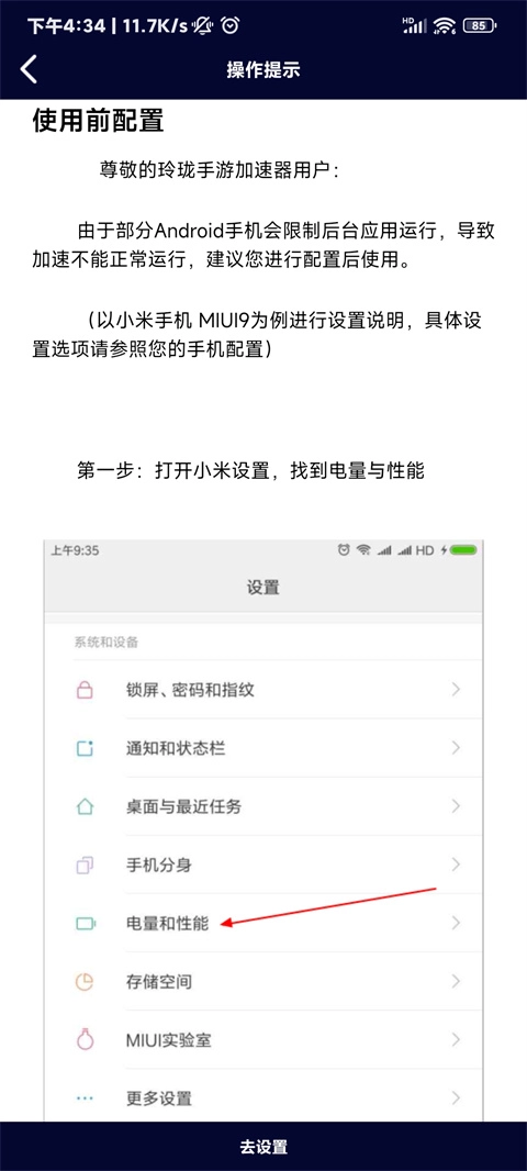 第一步:打开设置,找到电量与性能。