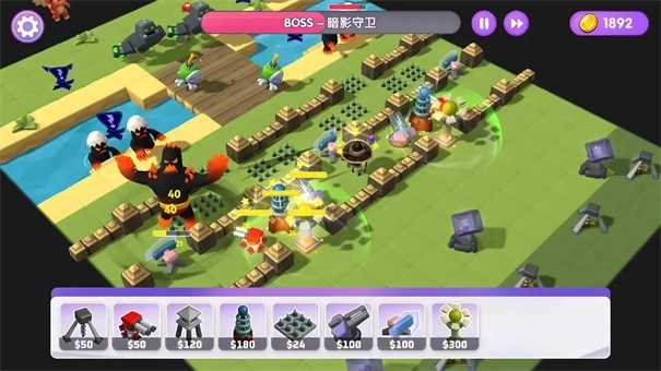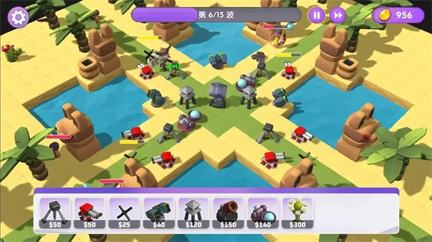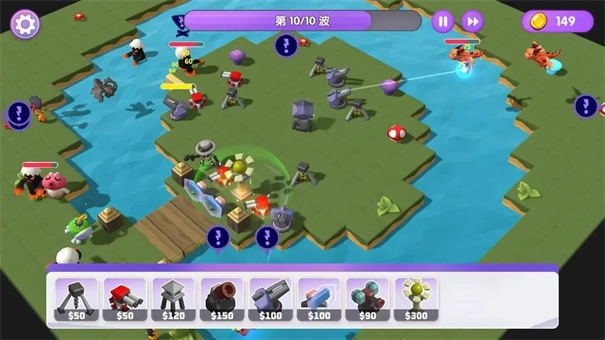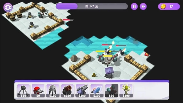3、二十多个特性各异的防御塔、告他、炮台、路障和陷阱,你可以对这些防御塔进行自由的搭配组合。