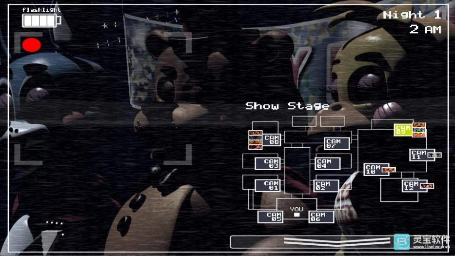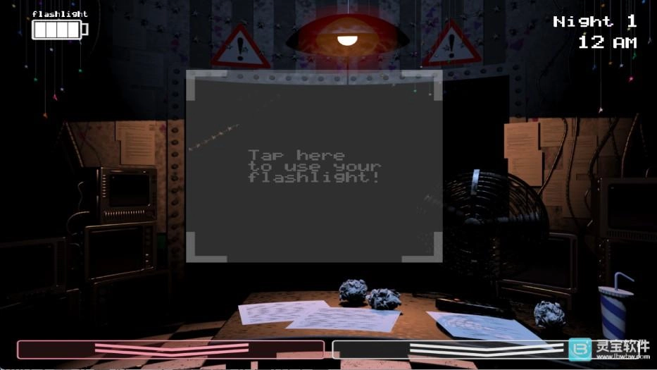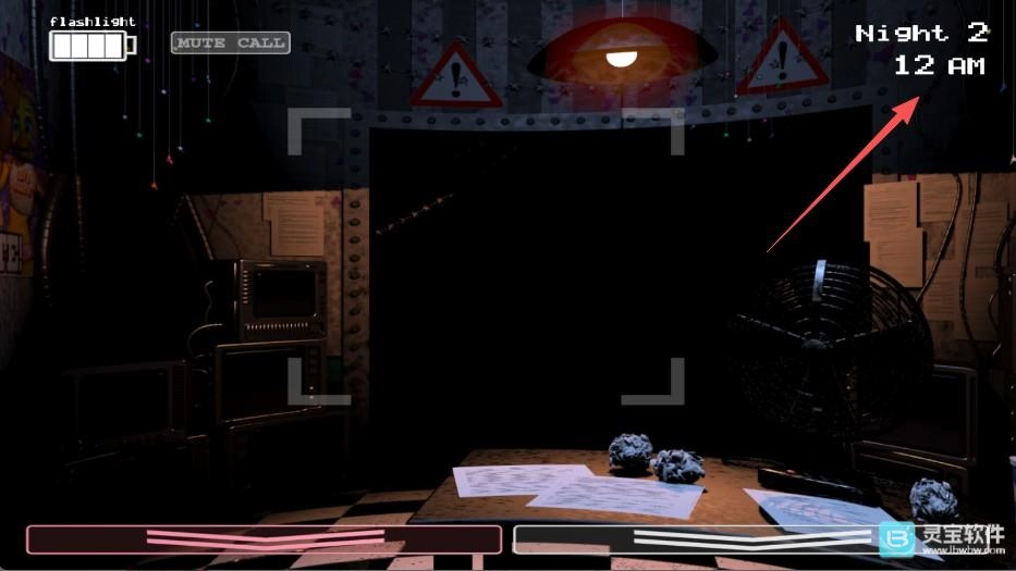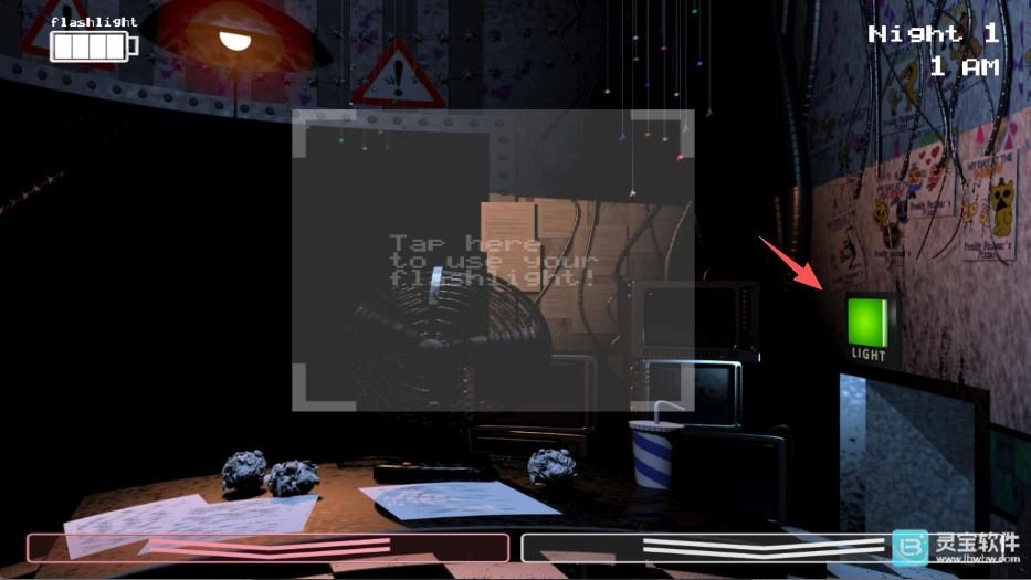 在游戏里,玩家所在的监控室左右两边各设有一个LIGHT按钮,可用来照亮左右两侧的通道;正前方得借助手电筒照明,才能查看大门口的状况。屏幕左下角是红色箭头按钮,右下角是白色箭头按钮,这两个按钮分别对应着不同的核心操作。