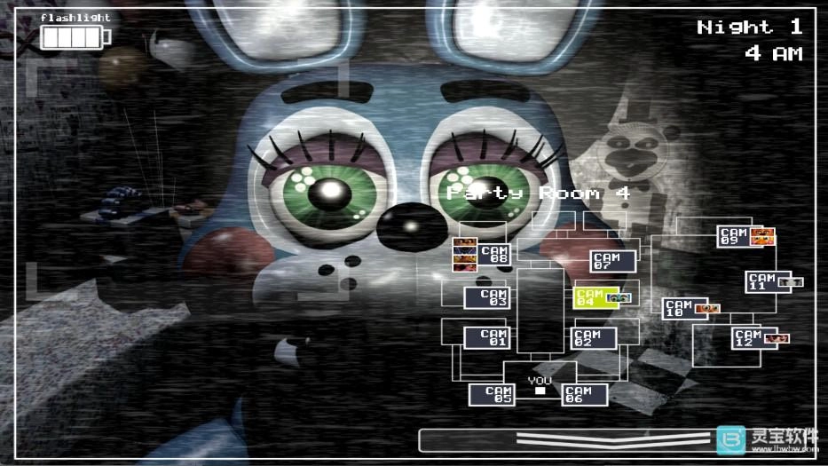 右下角那个白色箭头按钮是用来切换查看不同地点的,总共有十二个可查看的地点。切换之后得用手电筒照明,这样才能看清楚当前地点的状况。经常查看地点能帮助提前发现发起进攻的玩偶,从而争取到足够的反应时间。