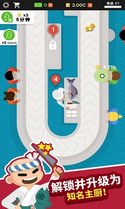 3、放置玩法,经过简单的管理,您的寿司店就可以按照您的分布格局一直经营下去了。