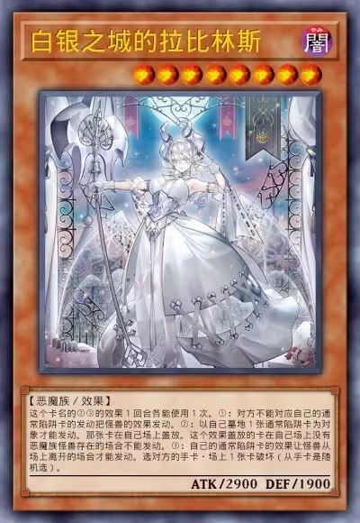 白银城核心卡,核心中的核心。一效果极度宽泛的召唤条件。二效果不被取对象、不被效破的不俗抗性,3000攻的高打点,确保其高强的站场能力。三效果为重中之重,从卡组检索任意通常陷阱,无字段、效果要求,调度能力惊人,将白银城运转流畅度、强度大幅提高。