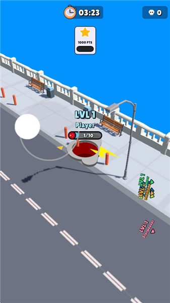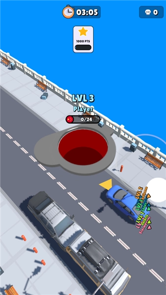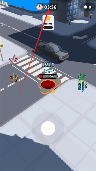 3、猥琐发育:在游戏刚开始的时候,所有黑洞一开始的体积都是一样大的。关键操作是在地图里(目前这个版本还没上线地图功能)持续移动,主动去搜寻可以吞掉的资源。因为刚开始黑洞的体积比较小,能吞的目标不多,只能吞那些比自己体积小的东西,所以得特意避开体积大的物品(像场景里的汽车这类),防止因为吞不了而白白耗费时间,还被更大的黑洞追着打。