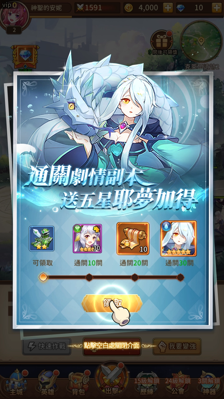 4、《神明召唤师》该游戏的福利很丰厚,免费的羊毛玩家们一定要薅啊,新手玩家游戏后,通过剧情任务,分阶段领取奖励,更可获得五星耶梦加得,玩家在游戏中都可以查看到,该游戏对新手玩家登入送礼物是相当大方了,这波羊毛玩家们不薅就错失一个亿了! 新手玩家千万千万不要错过哦!!!
