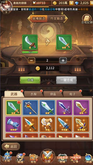5、《神明召唤师》该游戏玩家在战斗中获取的装备,新手玩家可以到主城的锻造屋,在锻造屋中根据系统提式选择装备锻造升级武器,如果玩家不知道怎么升级,可以点击一键合成就可以完成装备升级了,当然装备升级不仅有武器,还有衣服、头盔、鞋子都是相同的升级操作,玩家可以轻松搞定装备升级; 对于符文锻造,就需要玩家收集5种低阶符文,同类低阶符文可以合成高阶符文,符文的相关技能,玩家可以查看技能预览,从中可以看到低级技能、中级技能、高级技能的相关描述。 符文质量越高,拥有的技能等级和数量越高,玩家也可以在背包中对符文进行重铸,进而更换符文的属性和技能。 玩家对于策略类游戏,想怎么玩都可以根据自己的组合搭配来决定,该款游戏还是值得大家体验哦!