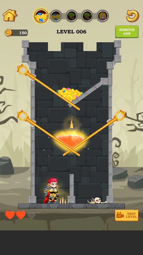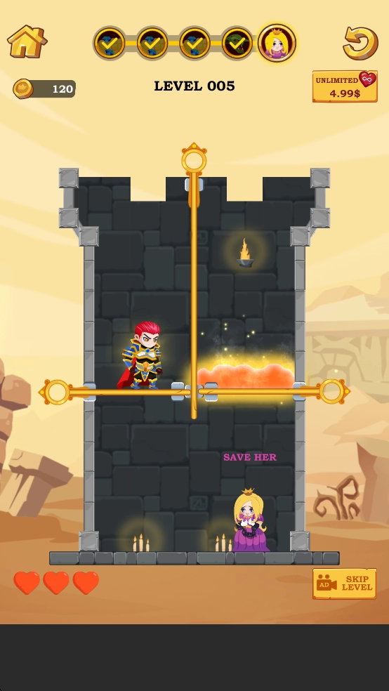 你是否热爱冒险?那是自然,冒险总是充满魅力。快加入英雄的行列,一起营救公主、夺取宝藏吧。只需拉动销钉,就能为公主开辟一条安全的通路。在这款全新的救援游戏里,你将化身富有的英雄,开启这段精彩旅程。