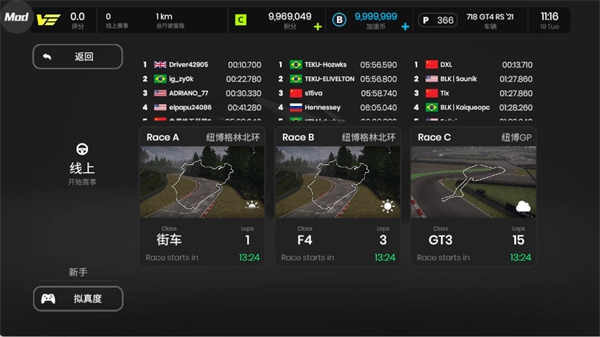 丰富车辆选择:提供多种真实赛车类别,如街车、GT4、GT3、LMP、F4、F1等,每种车辆都有独特的操控和调校。