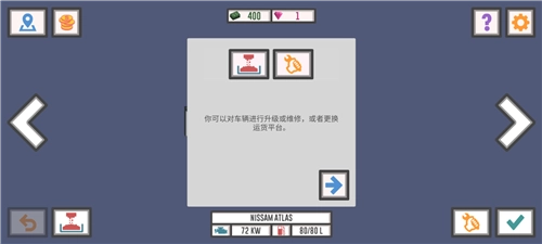 2、界面右侧手握扳手图标为维修功能,左侧红色沙漏图标可对车辆进行升级操作,提升车辆性能。