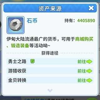 石币是日常运转最频繁的流通货币,它支撑着装备锻造、宠物喂养、建筑升级等基础建设。可通过勇士之路通关、游猎活动结算以及金贝兑换三种方式稳定获取,属于前期必须优先积累的基础资源。