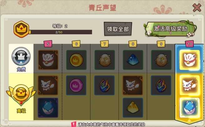 注意啦,青丘声望奖励分为免费档和高级档,高级档一旦激活,永久有效,可以随着声望等级提升就可以领取发放到主场景的稀有资源及S级幻兽-仙狐等一大波奖励,赚翻了!