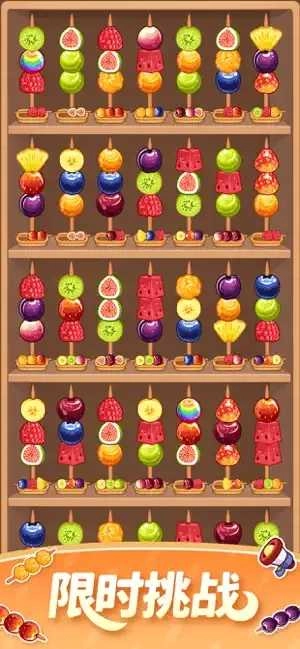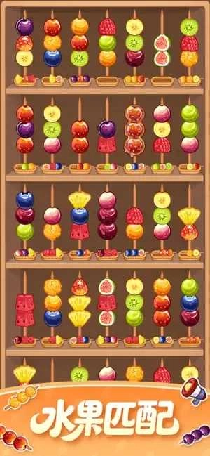 这里有色彩缤纷的卡通水果,还有晶莹剔透的糖葫芦。轻轻一点,调整水果的顺序,让每一串都变得完美!
