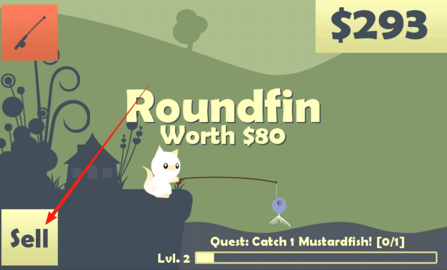 2、钓到鱼后,长按手机屏幕,就可以把鱼钓上来,点击左下角的【Sell】出售可获得金币