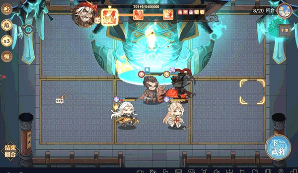他开场便施放一次全队范围打击,瞬间压低全员血线,随后进入长达四回合的固定模式:仅对正下方格子外的目标生效,若我方全体站位精准卡在BOSS正下方,则可完全规避所有伤害。