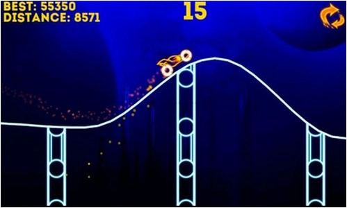 一辆马力强劲的炫光飞车,你要控制它在起伏的道路上奔驰;