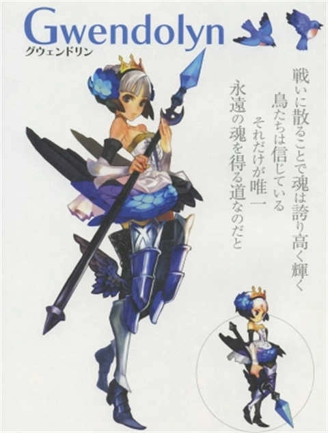 挥舞着魔晶长枪作为瓦尔基里勇敢地战斗,其英姿被敬称为“奥丁的魔女”。在姐姐格莉瑟妲深受他人信赖且优秀勇敢的阴影下长大,平时安静低调。她的战斗与其说是出于对国家、对国王奥丁的忠诚,倒不如说是为了博得父亲的关爱而采取的行动。虽然给人留下羸弱的印象,但一到关键时刻却有着无论面对何种困难都勇往直前的力量。