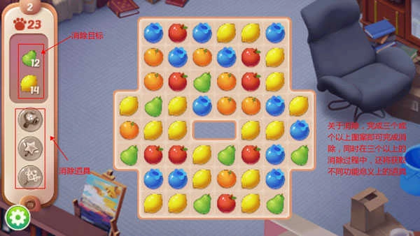 梦幻小屋游戏的核心逻辑蕴含在“消除即建造”的闭环之中:移除碍事的旧地毯,需通过三消来触发撬棍动画;解锁新的橱柜样式,要依靠连续横排消除来模拟木工刨平表面的过程;当连消次数达到七次以上时,天花板会自动垂落暖光灯带。所有建造动作均由消除行为自然引发,不存在突兀的菜单跳转,唯有砖瓦随着节奏生长的真实感。