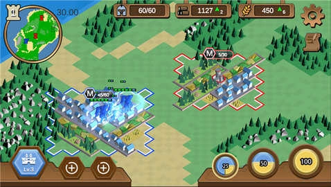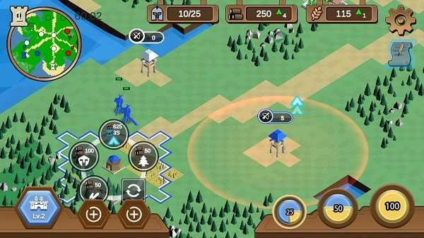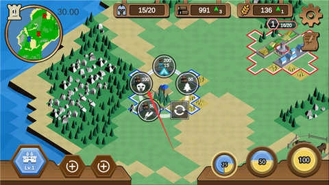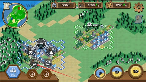 你可以可建造伐木场、农田、兵营,获得木材、粮食、士兵数,木材用于建造升级,粮食用于产出士兵,兵营用于训练士兵,所以这就需要玩家在这三种建筑和资源中相互权衡,以此达到最优的策略方针。