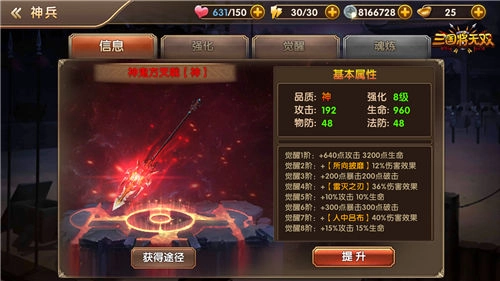 实力的提升不只是对自身的修炼,为神将装备一把称手的神兵,也能激发TA们200%的战斗表现!神鬼方天戟、万胜丈八矛、镇威倚天剑等霸气灵兵登场,可全面提升武将的攻防属性,从此披荆斩棘,谁堪为敌!