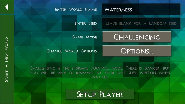 4、点击“new world”后,我们需要对创建世界进行自定义设置,设置完成后点击“setup player”