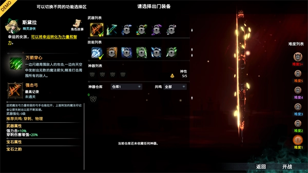 4、选择好角色后下一步就是选择武器,左侧为角色以及武器属性技能,中间是武器以及神器列表,后续可以解锁,右侧为难度选择;