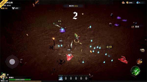 6、进入战斗后玩家只需要操控左侧摇杆进行移动即可,角色会自动进行攻击,坚持到上方倒计时结束即可顺利通关;