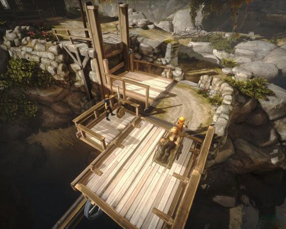 2.他们沿着蜿蜒的道路朝着桥的方向前行,途中遇到一个简单的解谜关卡。此处,弟弟因力气不足,无法扳动把手,这时就需要玩家操控哥哥来完成这一动作。成功过桥后,向右前进,来到一个断掉的梯子下方。哥哥发挥自身优势,将弟弟高高抬起,弟弟顺利爬上高处后,把旁边的绳子放下,助力哥哥也攀爬上来。随后,兄弟俩齐心协力,一同扳动升降机旁的把手,继续踏上征程。