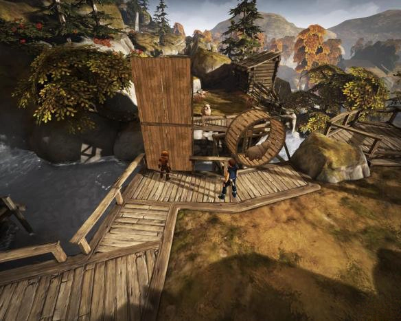 6.通过农舍后,兄弟俩会经过之前路过的粮仓上方,遇见一个正在哭泣的巨人。剧情过后,兄弟俩跟着巨人前行。巨人帮助他们翻过路上的许多障碍,兄弟俩踩着巨人的肩膀过河后,爬到对面的枯藤上。等待巨人从下面爬上来,再从巨人肩膀上爬过。巨人将兄弟俩扔至对面后,他们爬到一个平台上。等巨人两手张开后与他互动,巨人会带着兄弟俩跳下瀑布。