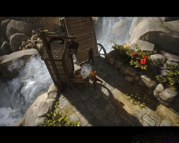 5.继续往下走,兄弟俩一起推开一扇门,进入一个类似存粮食的地方,这里有几口井,弟弟与井互动时还会往里面吐痰。此时,一条狗不停地朝着兄弟二人狂叫。玩家需要巧妙切换兄弟俩与狗互动,先让弟弟吸引狗的注意力,哥哥趁机跑到“鼓”上,然后哥哥吸引狗的注意力,使弟弟能够通过,如此反复,成功通过此处。往前走,通过一系列障碍后,来到一家农舍前。此处有一座小桥,玩家先让弟弟在桥旁边的开关处不停跑步,哥哥则前往对岸抱一只羊回来,将羊扔到开关上,让羊代替弟弟跑步,这样兄弟俩就可以顺利通过小桥。