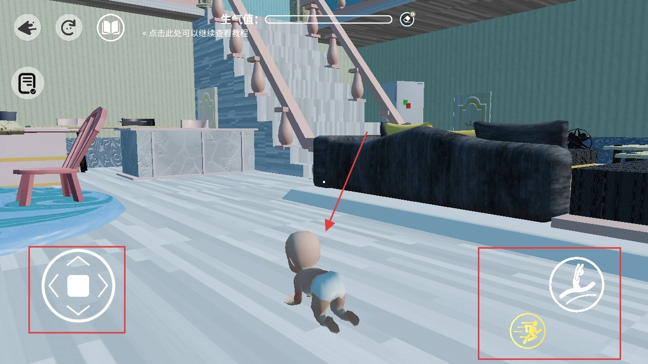 2.进入游戏后,用左侧摇杆移动、右侧按键爬行,奔跑,操控婴儿
