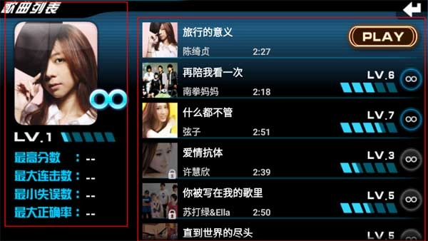 进入游戏后,点击屏幕就能进入主界面。主界面左侧显示玩家的等级、最高得分、最大连击数和最高准确率等信息,右侧是歌曲列表。一开始只能玩第一首歌,等等级提高了,会解锁更多歌曲。
