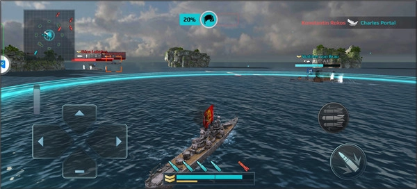 使用左侧虚拟方向键控制战舰移动,灵活调整位置以规避敌方火力。