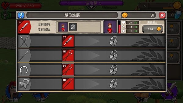 2、点击普通按钮旁边的【单位】按钮,就可以打开兵种界面进行兵种升级。