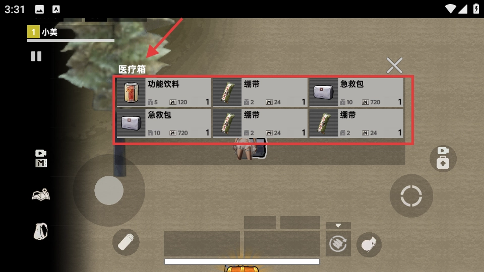 3、打开医疗箱,整理【功能饮料】-【绷带】-【急救包】,确保药品充足,提升生存能力。