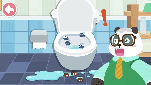 卫生间里好脏,快来打扫一下!清理讨厌的小虫子,再给马桶喷上清洁剂和杀菌药水,刷完一按冲水建——咦,水下不去?原来是水管坏了,宝宝快来接好它!(锻炼宝宝脑力)