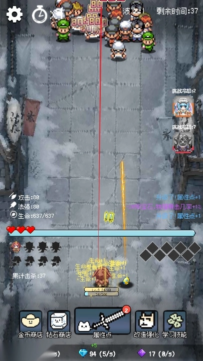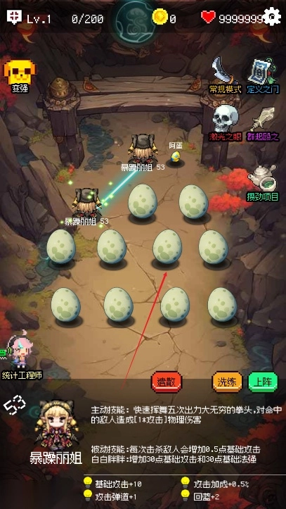 进入游戏→右侧“攒劲项目”→无尽挑战→群起殴之→开打,属性点点攻击撑前期,多点点天使打了拿经验,每10级可以在右下“支援技能”中选一个英雄的主动或被动技能,先选“音乐专家”的主动技能回血加血上限,再选“蜡烛人”的主动技能打伤害,再选“果子哥”的主动技能是触发所有其他英雄的主动技能,后面还可以选“狐妖”加血上限更快,多选几个“果子哥”触发其他人技能