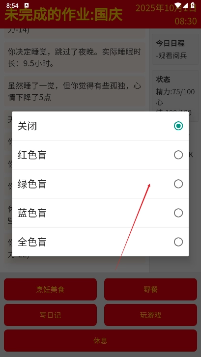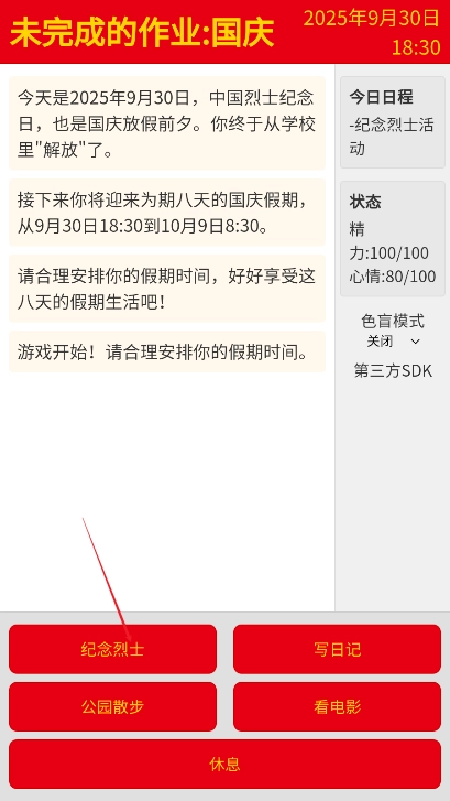 未完成的作业国庆游戏安卓版(com.zhkg.zhijian)是一款轻松氛围的文字冒险游戏,玩家能体验一段特别的假期生活。游戏背景设定在国庆与中秋假期,玩家将以学生身份,度过八天充实的假期时光。在此期间,你需要做出选择,决定是参与各类活动,还是选择休息放松!