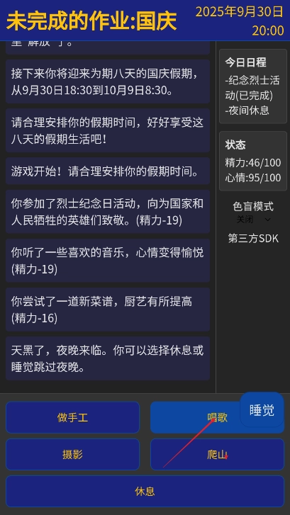 在呈现形式与体验优化方面,纯文字的展现形式简洁明了,有助于玩家聚焦于剧情推进与选择决策,不过视觉吸引力有所欠缺——界面设计相对简单,缺少角色立绘、场景插画等辅助视觉元素,长时间游玩容易使玩家产生视觉上的疲惫感。另外,部分特殊活动的触发条件不够清晰,比如“解锁读书会”所需的具体操作并未提供任何提示信息,这可能导致玩家错失重要剧情内容。因此建议在游戏里添加“假期手册”这一功能,通过间接的方式提示隐藏活动的触发方向,从而增强玩家的探索体验。