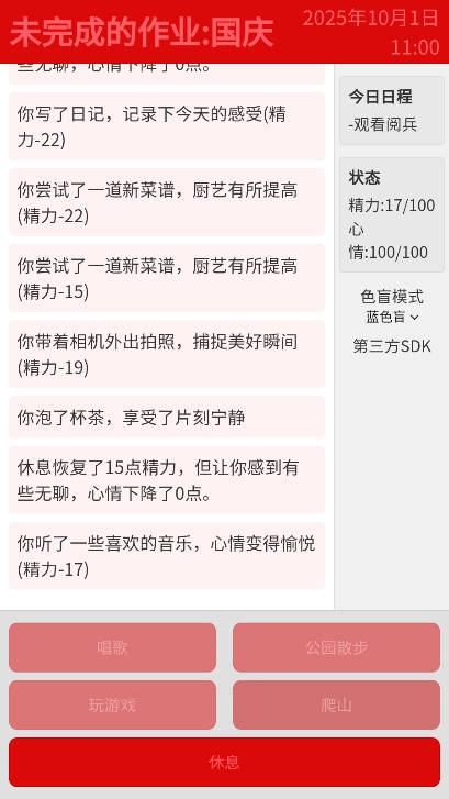 更棘手的是,小宇发现自己的“精力值”仿佛有了实体——熬夜打游戏会让第二天精神萎靡,根本没法专心听课;连续参加户外活动虽开心,却会累到连作业题目都看不进去。而假期中还藏着意外惊喜:若能在中秋当晚陪爷爷去公园赏月,可能会触发“听爷爷讲过去的故事”的特殊剧情;若按时完成每日的英语打卡,或许能解锁同学组织的“国庆读书会”活动。