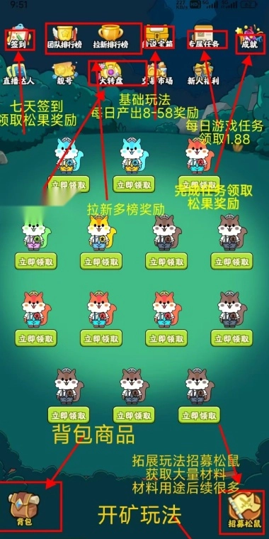 ①零撸玩法注册即赠100松果(初始燃料),每日自动释放1%,复投可加速释放,形成“释放-复投-增值”的财富雪球。每日3分钟操作(签到/领产出/转赠),离线仍持续收益,真正“躺赚”链游。