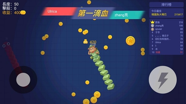 游戏的核心玩法围绕两种主要模式展开:玩家通过操纵摇杆控制蛇身移动,吃掉地图上的金币来让蛇不断变长;同时可以长按加速键,结合灵活的走位,引诱其他对手撞到自己的蛇身,进而吸收对方积累的金币,实现蛇的快速成长。